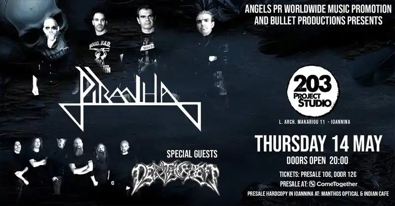 Οι εμβληματικοί PIRANHA ανεβαίνουν στη σκηνή για μια δυναμική ζωντανή εμφάνιση στο Studio 203. Με τον γνώριμο ήχο τους, οι PΙΡΑΝΗΑ υπόσχονται ένα live γεμάτο ένταση και ταχύτητα. Το setlist θα περιλαμβάνει κομμάτια από την πορεία τους που ξεκινάει απ΄το 1987 και συνεχίζεται.