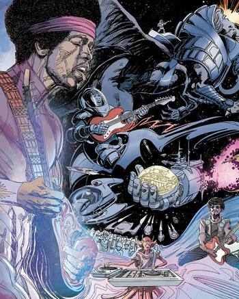 “Αυτή η επική περιπέτεια βλέπει τον εμβληματικό Jimi Hendrix όπως δεν τον έχετε ξαναδεί! Η ιστορία βλέπει τον Hendrix να ξεκινά μια επικίνδυνη αναζήτηση στο κέντρο του σύμπαντος αναζητώντας ένα μαγικό φυλαχτό αρκετά ισχυρό ώστε να ξεκλειδώσει την απίστευτη δύναμη του ήχου του, ώστε να μπορέσει να απελευθερώσει έναν πολυάριθμο πληθυσμό που διψάει από ροκ εν ρολ, από μια τυραννική διαγαλαξιακή δύναμη που επιδιώκει να φιμώσει τη μουσική και να υποδουλώσει όλη τη ζωή.